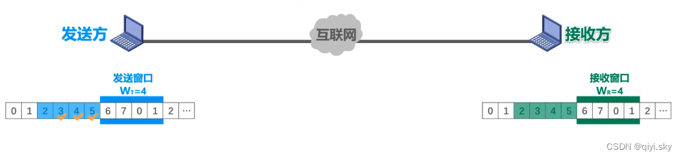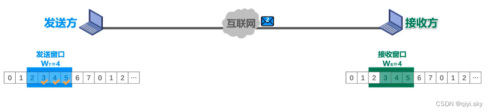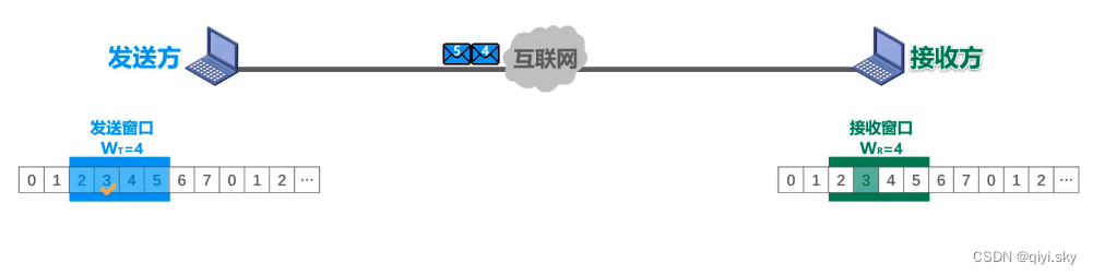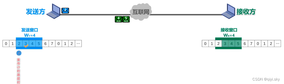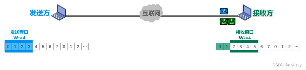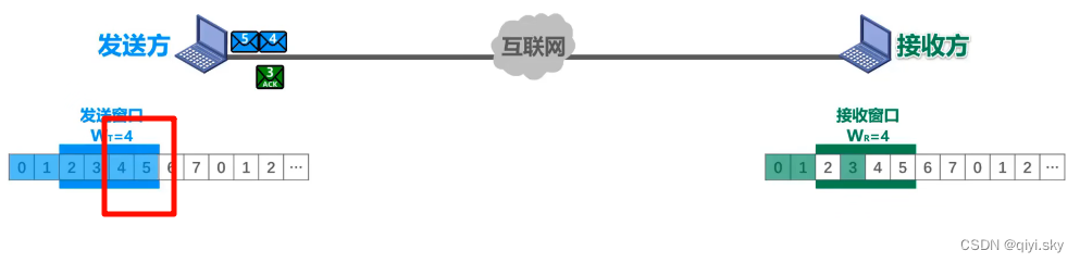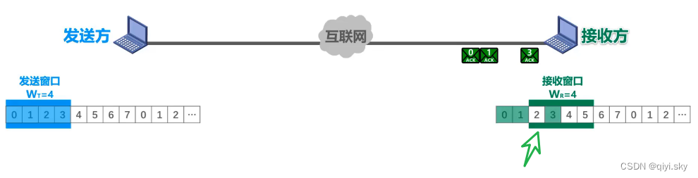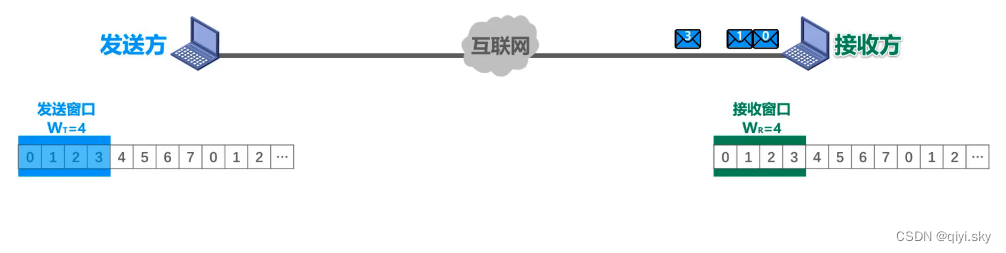 发送方将序号落在发送窗口内的这4个数据分组依次连续发送出去,他们经过互联网的传输,陆续到达接收方,但其中的2号数据分组丢失了,只要序号落入接收窗口内且无误码的数据分组,接收方都会接收。