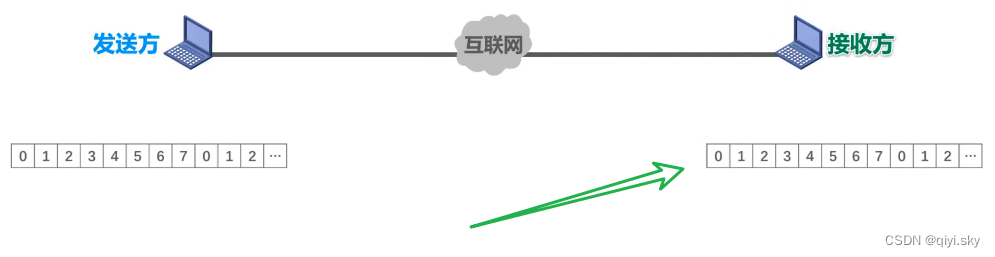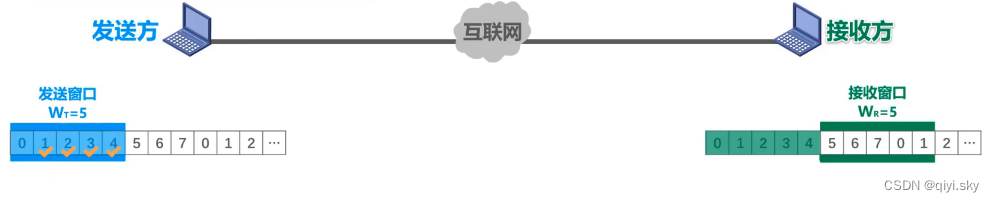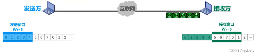 发送方将序号落入发送窗口内的0-4号这5个数据分组依次发送出去,他们经过互联网的传输依次到达接收方,接收方接收他们并发送0-4号确认分组,接收窗口向前滑动5个位置,这样就有5、6、7、0、1这5个新的序号落入接收窗口。