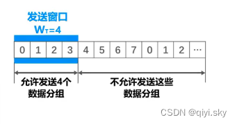 如下图所示,序号落在发送窗口内的这4个数据分组可以连续发送;而序号落在发送窗口外的数据分组不允许发送。