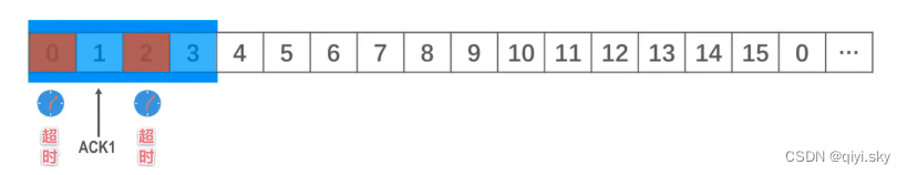 发送窗口不能向前移动。一段时间后,0号数据分组的重传计时器超时了,发送方重传0号数据分组
