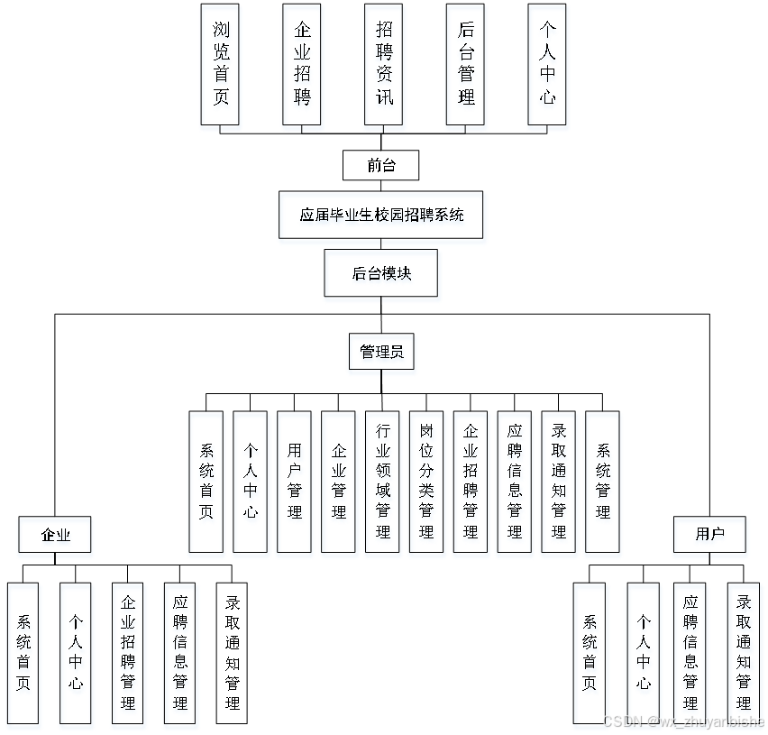 这些功能可以充分满足应届毕业生校园招聘系统的需求。此系统功能较为全面如下图系统功能结构如图4-1所示。