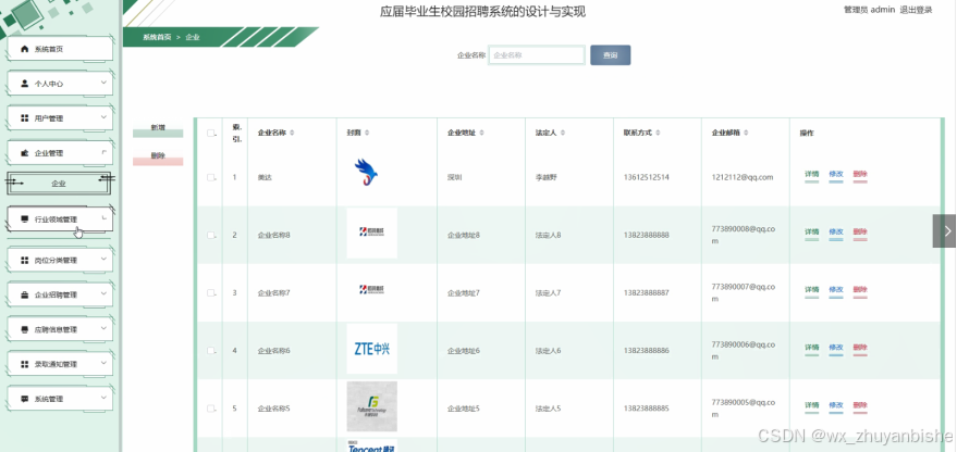 管理员点击企业管理,在企业管理页面输入企业名称、封面、企业地址、法定人、联系方式、企业邮箱信息,然后进行查询、新增或删除企业信息等操作,如图5-10所示。