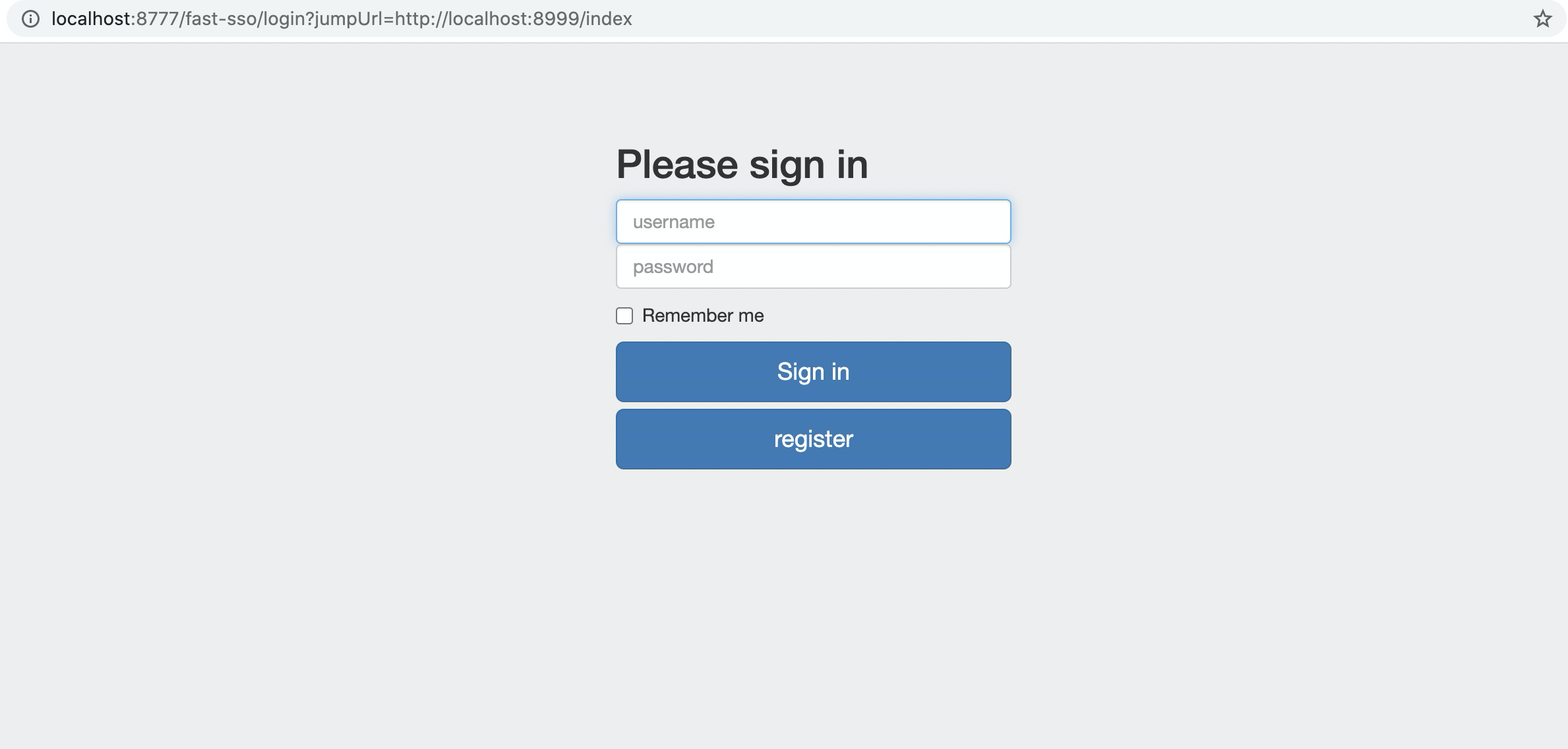 访问接入fast-sso的应用:localhost:8999/index ,因为未登录,自动跳转到统一认证服务的登录页