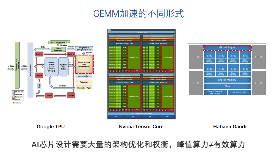 Nvidia为加速GEMM在GPU中设计了新的Tensor Core和相应的矩阵运算指令。第一代Tensor core主要执行4X4矩阵的运算,最新发布的第三代tensor core规模大一点,但相对TPU的MAC阵列,粒度细很多,同时Tensor Core和GPU架构紧密融合。他的优势是使用比较灵活,比较容易兼容CUDA编程模型。对于非GEMM类型的操作,则可以在GPU传统的计算单元中处理。但如果单纯看GEMM加速的效率,在有些情况下比规模更大的GEMM引擎要差一些。