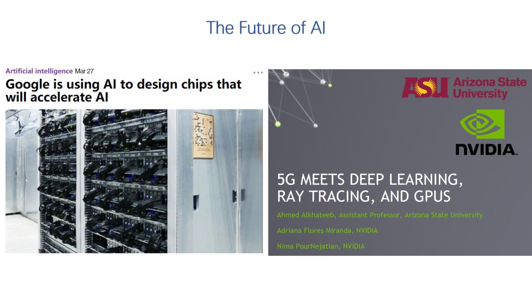 当然,在一些成熟AI算法不断优化执行效率的同时,新的突破还是往往需要更多的数据和更大的模型,比如最近的GPT-3。同时,AI应用场景也越来越广,这两个例子是最近比较热的话题,把AI用于芯片设计和把AI用于5G的信号处理。因此,AI发展对算力和算力效率的需求在可预见的未来不会减弱。
