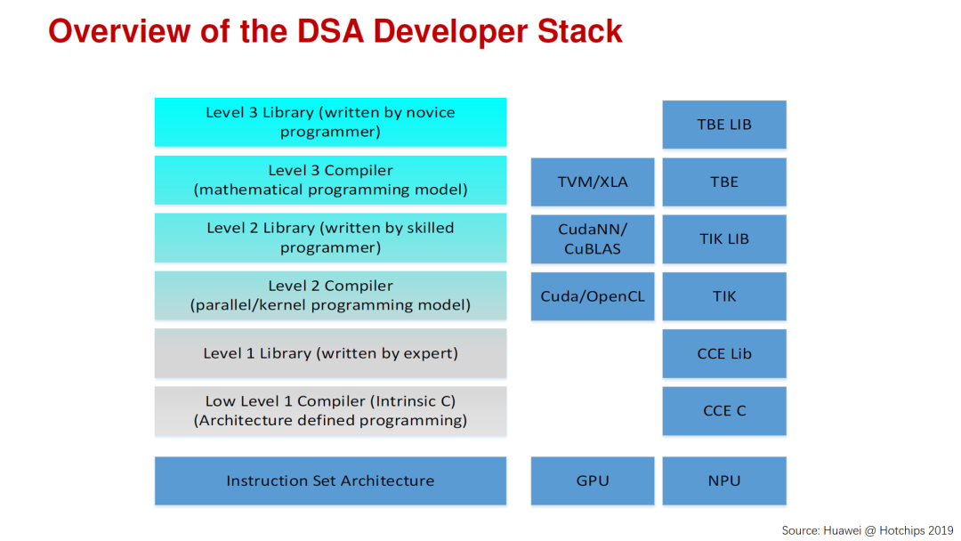 下面我们来看看软件栈方面的情况。我们前面已经强调了专用处理器的软件工具链方面的挑战和重要性,这里还是看看华为在hotchips上介绍的例子。对于领域专用处理器来说,其用户往往也是开发者。这里将用户分成了不同的情况。对于专家级的用户,你需要开发更低层次的编程接口,用户自己会做更多的优化工作。而对于普通用户,只会在抽象层次比较高的编程接口和模型上工作,大部分的优化工作需要工具链中的编译器来完成,或者通过优化后的库来支持,不过这两类工作的挑战都不小。