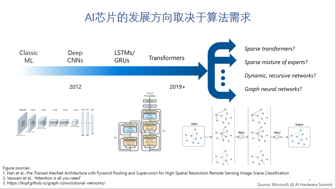 AI芯片的本质是一个领域专用架构,那么它发展的方向是完全取决于AI领域算法和应用发展的方向。2012年的Alexnet到2018年的Transformer,其核心计算还是稠密矩阵运算,这也是目前AI芯片支持的最好的计算模式。但在现在这个时间点,AI算法的走向还不是很清晰,未来每个分支的计算需求可能相差很远。在出现一个统一的模型之前,也很难形成一个统一的AI芯片架构。