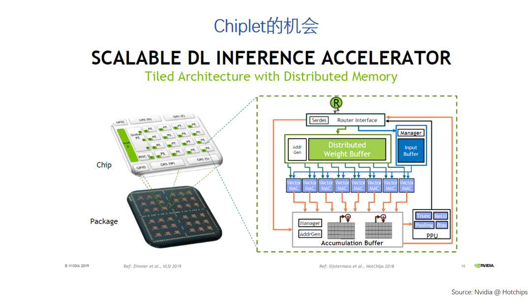除了领域专用计算方法之外,另一个可能延续摩尔定律的技术是Chiplet,现在一种比较有意思的中文翻译是“芯粒”,芯片的芯,颗粒的粒。简单来说,就是基于先进的封装技术,可以把多个芯片的裸片封装在一起,通过这种模式而不是单纯靠芯片工艺的升级,来提升整体的性能。这些裸片可以是相同功能的算力扩展,也可以是不同功能,不同架构,甚至不同工艺的裸片的组合。这里给出的是Nvidia在Hotchips上展示的研究,通过chiplet技术实现一个可伸缩的deep learning加速器。这个话题很大,想象空间也很大,给我们带来的可能不止是技术上的进步,还可能是芯片设计模式和方法上的改变,甚至商业模式上的创新。时间关系就不展开了,有兴趣的朋友也可以看看我之前分析的文章。