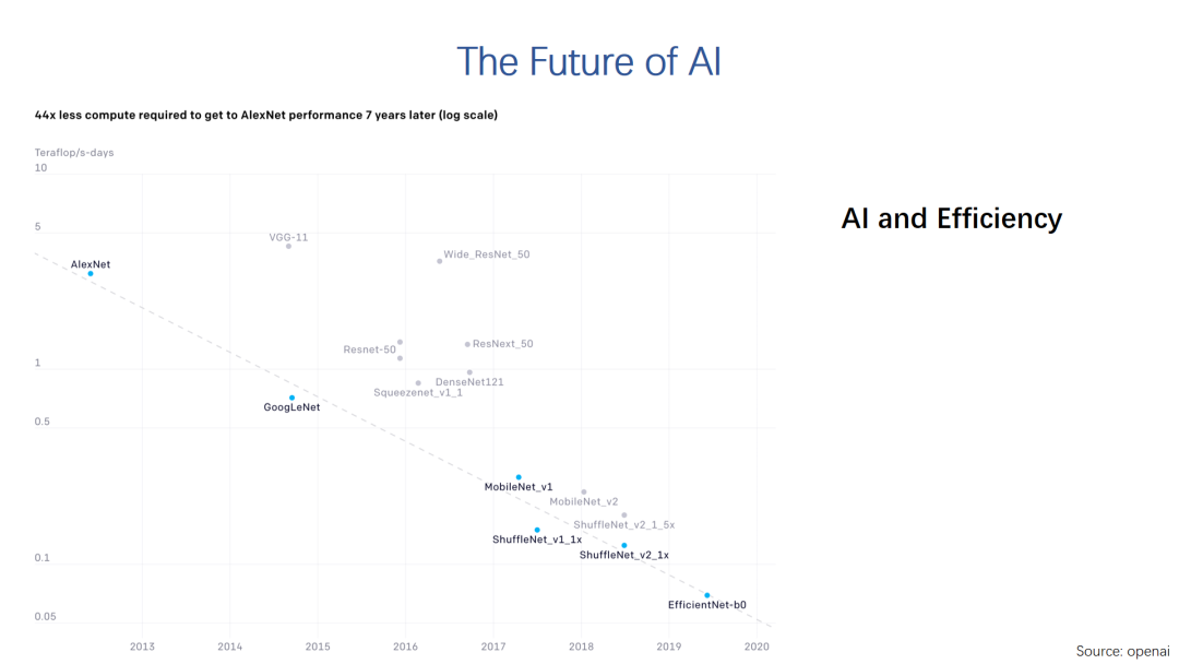 除了AI硬件越来越强,神经网络模型也在进化。OpenAI正好在最近又发布了一个报告,是说从2012年到现在,大家设计的神经网络模型的效率越来越高,训练一个具有同等精度的模型的计算代价减少了大约44倍,也就是说现在设计的很好的小模型完全可以达到之前大模型的精度。当然,这并不是说我们就不需要硬件加速,这里毕竟只是有限的场景。这个报告还有一些其它的有趣信息,比如从17年开始,训练一个resnet50,按美元计算的成本下降了184x,这个数据应该是Google TPU实现的。这也说明,这几年专用硬件加速技术的发展,对提高AI计算的效率做出了很大的贡献。