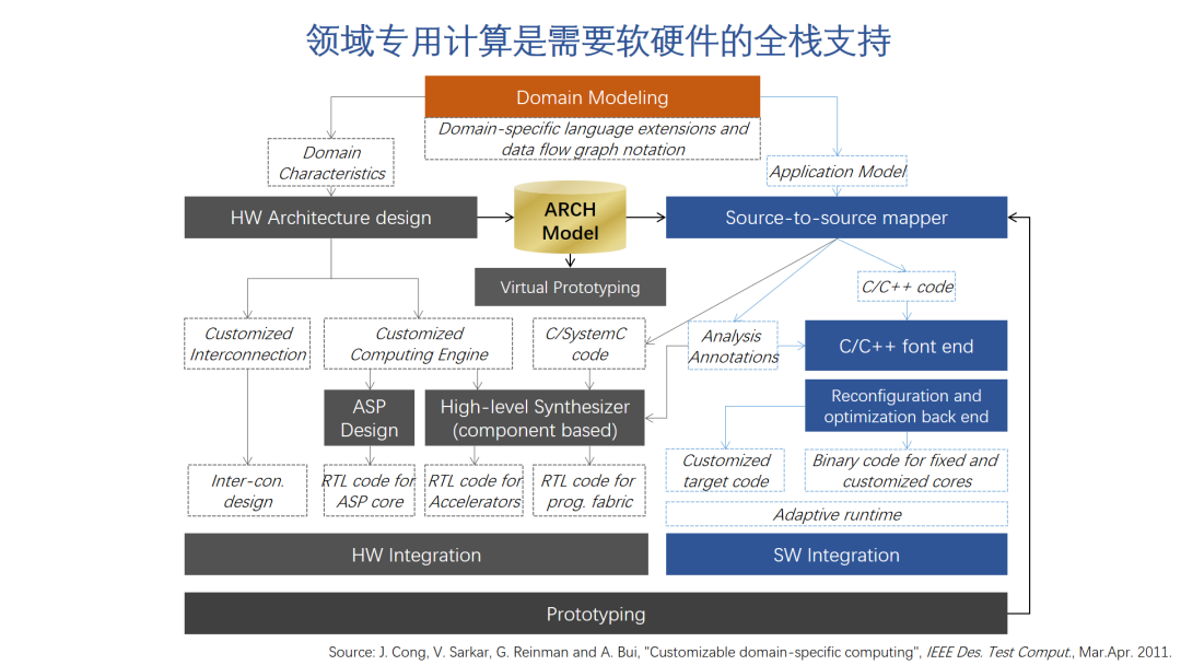 领域计算并不是一个新的概念,这里这张图是我在2013年基于之前的一篇论文总结的,主要是描述领域专用处理器的设计方法学,这里也可以看出我们在解决一个领域专用计算问题的时候要做哪些事情。首先需要对特定领域进行建模,把需求模型化和量化,作为后续工作的评价标准。建模可能会使用特殊的语言扩展或者数据流图的形式。Domain Model是后续开发的基础,据此可以得到两个重要的中间描述,分离出指导硬件设计和生成应用软件代码的两部分信息。硬件架构设计的主要工作是设计专用的计算引擎(Customized Computing Engine)和互连机制(Customized Interconnection)。计算引擎分为三种:专用处理器(ASP),硬件加速器(HW Accelerators)和可编程阵列(Programing fabric)。图的右半部分就是软件开发的工作和相应的工具。细节内容我就不展开讲了,感兴趣的朋友可以看看我的公众号上关于专用处理器的文章。这里我只想强调一点,就是我们设计一个专用处理器,往往需要设计新的指令集架构,编程模型,甚至是新的编程语言。这也意味着我们可能没有现成的软件工具可以使用,我们在设计和优化新的硬件的同时,必须打造新的软件工具链。只有提供全栈的软硬件,才能让用户特别是开发者利用好新硬件的能力。这个也是专用处理器设计的一个巨大挑战。