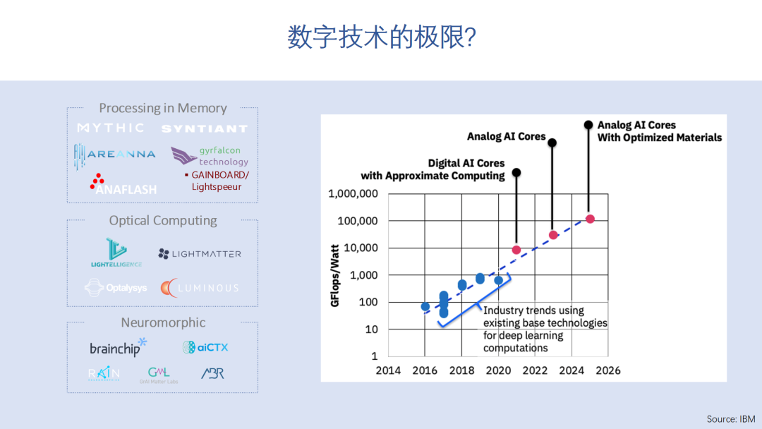另外一个有趣的问题是,如果算法不发生大的变化,按照现在AI加速的主要方法和半导体技术发展的趋势,我们有可能在不远的将来会碰到数字电路的极限。比如IBM就提出,1到10TFlops/W基本就是数字电路实现目前的深度学习计算的效率极限,在往后则要靠近似计算,模拟计算,甚至是材料上的创新了。所以我们也看到很多初创公司在做这个方向的尝试。