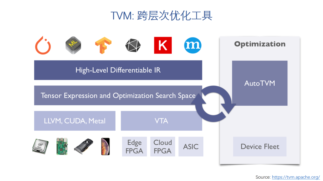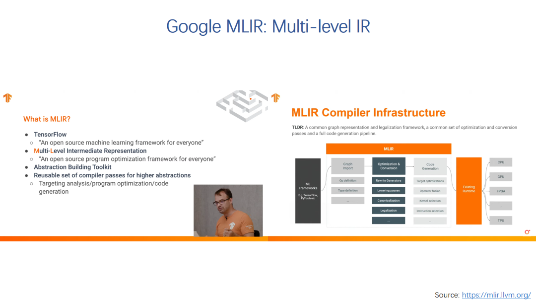目前的开源AI编译器项目也非常活跃,这其中最有代表性的两个是TVM和Google的MLIR。这两个编译器也都融入了很多先进的思想,从一般的编译器功能扩展到软硬件协同设计的概念。比如TVM就包括了一个开源的硬件加速器VTA,展示了从编译器到硬件加速器联合优化的初步尝试。而AutoTVM也是一个自动的编译优化工具。