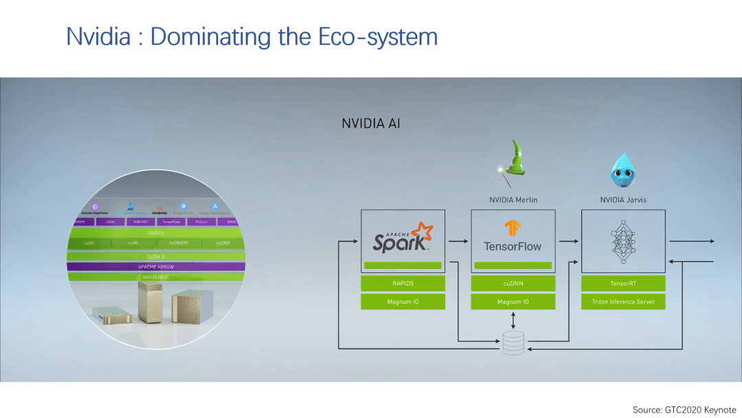 在这次的厨房展示中,黄教主说的最多的一个词可能是end-to-end,也就是端到端的支持,还给出了很多实例,比如对于推荐系统和交互是语音结合自然语言处理这类的系统都给出了专门的解决方案。而Nvidia AI就是一个端到端的软硬件加速方案,从大数据处理,到AI的training,再到inference,可以说把Nvidia的生态优势发挥到了极致。其中对于推荐系统,Nvidia专门推出了一个Merlin框架,解决用GPU加速推荐系统的问题。对这个问题感兴趣的朋友,可以看看“如何加速推荐系统?这是个高价值问题”。
