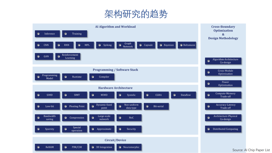 要说技术趋势,学术研究应该是最好的风向标。最近我们做了一件事情,整理了一些近几年体系结构顶会中的论文(ISCA,ASPLOS,MICRO,HPCA),对和AI相关的研究加了些标签,形成了一个AI芯片相关论文的列表,方便大家查询。同时我们也分析了一下相关研究的趋势,AI芯片架构方面的研究从14年开始,到17年都非常活跃,有很多创新的工作。近两年,相关研究还是很多,但在架构层面已经很难看到大的创新了,这也是AI硬件加速技术走向成熟的正常表现。未来可能更多的创新会来自和电路和器件级技术的结合,比如存内计算,类脑计算;或者是针对特殊的计算模式或者新模型,比如稀疏化计算和近似计算,对图网络的加速;或者是针对数据而不是模型的特征来优化架构,等等。另外,软件和编译器层面的技术优化还是很大空间,而跨边界的优化技术和方法学也是值得关注的方向。