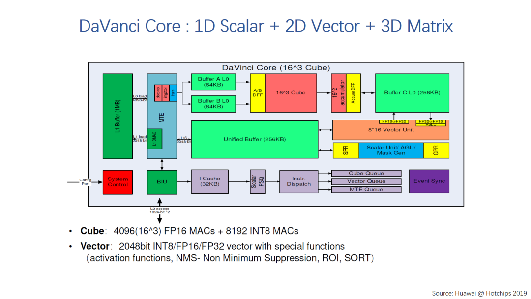 下面我们看一下华为在去年的Hot chips会议上展示的达芬奇AI处理器架构,它吸取了过去几年AI硬件加速的经验,融合向量,标量和矩阵的的运算。3D Cube:16*16*16三维弹性立方体,可在一个时钟周期内完成4096个FP16 MAC运算。而这个核通过不同的配置,可以作为 几十毫瓦的IP到支持几百瓦的芯片,的不同场景,比如高能效的Ascend 310到算力最强的Ascend 910。应该说达芬奇架构代表了对现阶段AI硬件加速的比较一致的认识,大家有兴趣也可以去看一下《昇腾AI处理器架构与编程》这本书,有很多详细的介绍。
