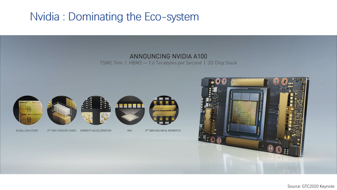 首先是Nvidia新推出的A100,给AI硬件加速又设定了新的标杆。A100是7nm工艺,使用HBM2存储器接口,3D封装,整体性能有大幅提升。具体来说,Tensor Core支持更多的数据类型,特别是AI中常用的数据类型,支持固定结构的2:4稀疏化处理。FP16/BF16的峰值处理能力是312TFLOPS,INT8的峰值处理能力是624TOPS,如果是稀疏处理的情况,则最高性能翻倍。近几年很多AI芯片初创公司都说自己的芯片硬件性能比Nvidia GPU高几倍,不过现在看来,即使单看硬件,A100的指标也是最强的。