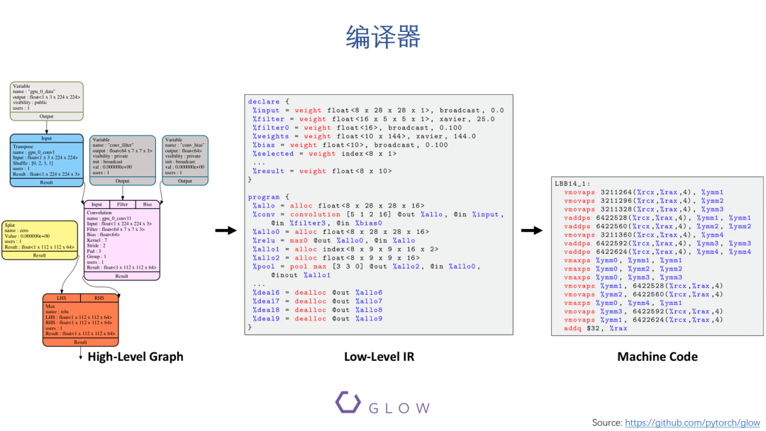 下面我们讨论一下在软件栈里面非常重要的编译器。这张图来自Facebook开发的GLOW编译器,这里主要用来展示一下一般来说AI领域的编译器是做什么的。首先,和传统的编译器类似,AI编译器也是在不同的中间表示,也就是IR之间,进行转换和优化的工具。但它的输入一般不是编程语言而是神经网络模型,比如是这里的计算图的形式,这个计算图可能是来自上层的机器学习框架。AI编译器也可以在图的层次进行一些优化,然后转换为层次更低的IR,IR可能有多个层次,编译器就是逐渐的降低IR的层次,最终生成硬件能够运行的代码。我们可以看到,AI编译器的IR会有AI运算的特点,比如AI中常用的算子,conv,relu,pooling等等。此外AI编译器还需要使用一些新的优化技术和算法来优化计算图或者算子的实现。