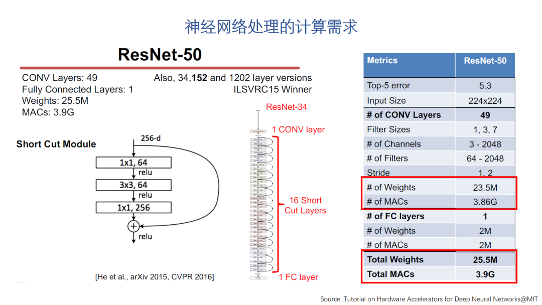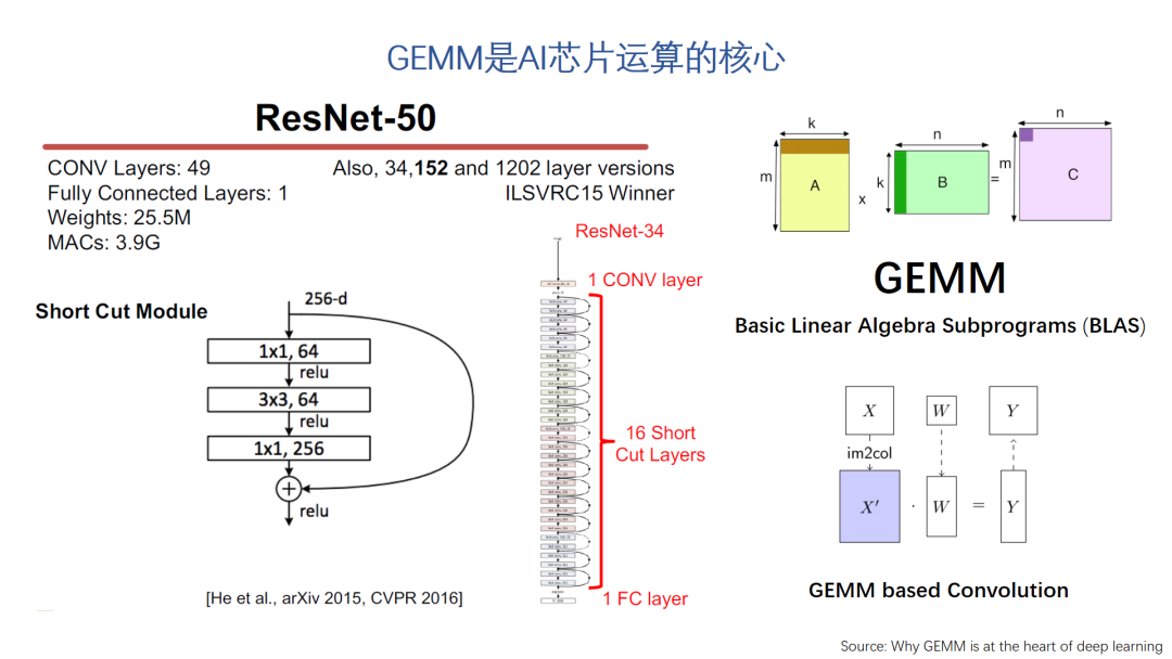 如果我们按照设计领域专用处理器的思路来考虑AI芯片,那么我们首先需要分析AI领域的计算模式特征。这里展示的是我们非常熟悉的Resnet-50神经网络模型。Resnet在图像处理任务里使用非常广泛,它需要的计算量还是比较大的。做一次正向处理大约需要3.9G的MAC。但如果我们进一步分析它需要的运算,其中绝大部分是卷积操作。这在各类CNN网络里是非常常见的。如果我们观察其它常用的神经网络模型,不难发现使用最多的操作的类型是很有限的,而需要运算量最大的基本是卷积和矩阵乘这类的操作。考虑到卷积实际上也可以转换为矩阵乘,神经网络的核心处理可以归结为GEMM类型运算。因此,加速神经网络的核心问题就是加速GEMM类运算的问题,这个也是一般AI芯片设计需要首先考虑的问题。