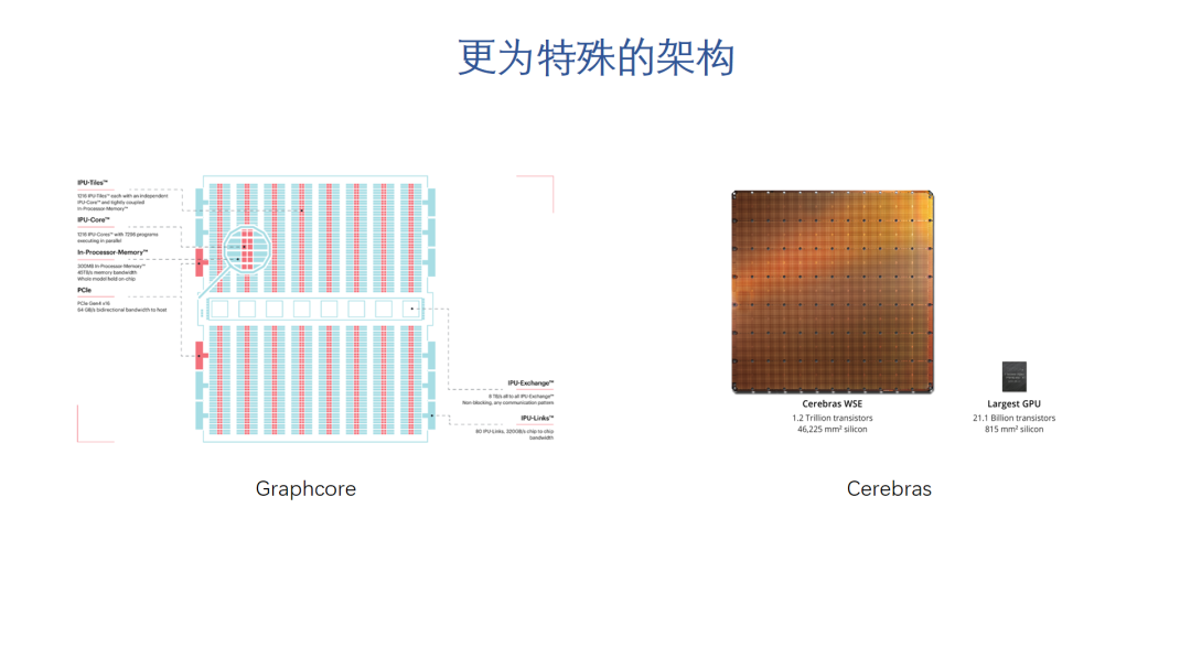 当然,这几年AI芯片的热潮也给我们带来一些很有意思的,比较特殊的架构。比如,Grophcore的IPU是一个大规模并行,同构众核架构。最基本的硬件处理单元是IPU-Core,它是一个SMT多线程处理器,可以同时跑6个线程,更接近多线程CPU。芯片上有一千多个小的这种通用处理器核。同时,芯片没有外部存储,而是实现了300M左右的片上存储,这个也是很少见的。Graphcore还设计了一个相当简洁的多核通信和同步机制,大大简化的硬件设计和多芯片扩展的难度。而另外一个更激进的架构是Cerenbras的wafer级芯片,也就是整个wafer产出一颗芯片,可以说是工程上的奇迹。不过,目前看来这个芯片还是主要用在非常专用的场景。我们当然也很希望未来看到更多有意思的架构出现。