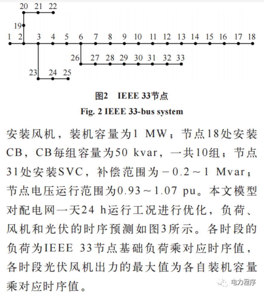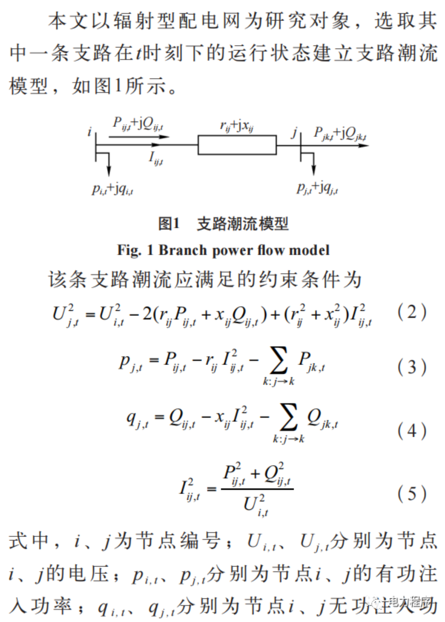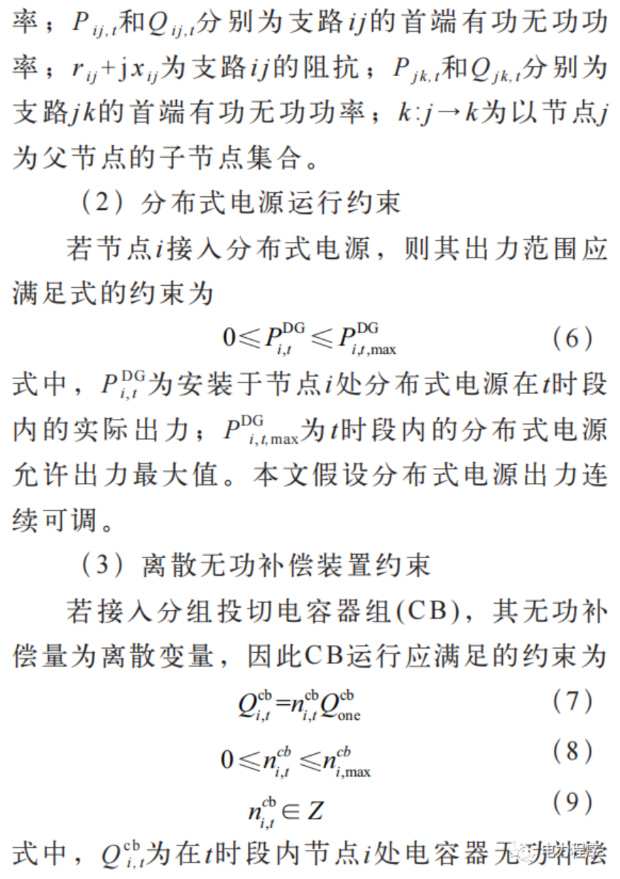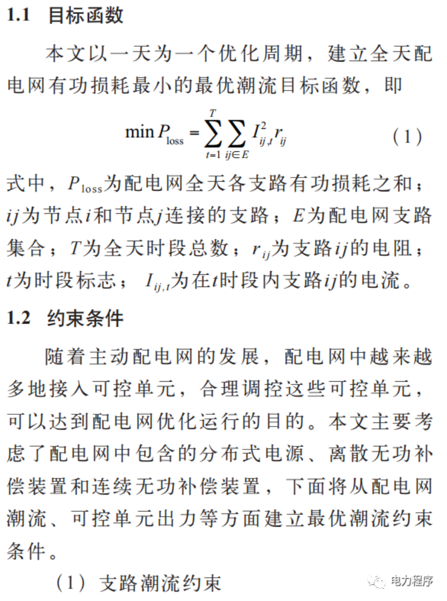 最优潮流计算是电网规划、优化运行的重要基础。首先建立了配电网全天有功损耗最小化的最优潮流计算模型;其次结合辐射型配电网潮流特点建立支路潮流约束,并考虑配电网中的可控单元,包括分布式电源和离散、连续无功补偿装置,建立其出力约束,该模型为非凸非线性模型;然后通过二阶锥松弛将该模型转化为包含整数变量的二阶锥规划模型。