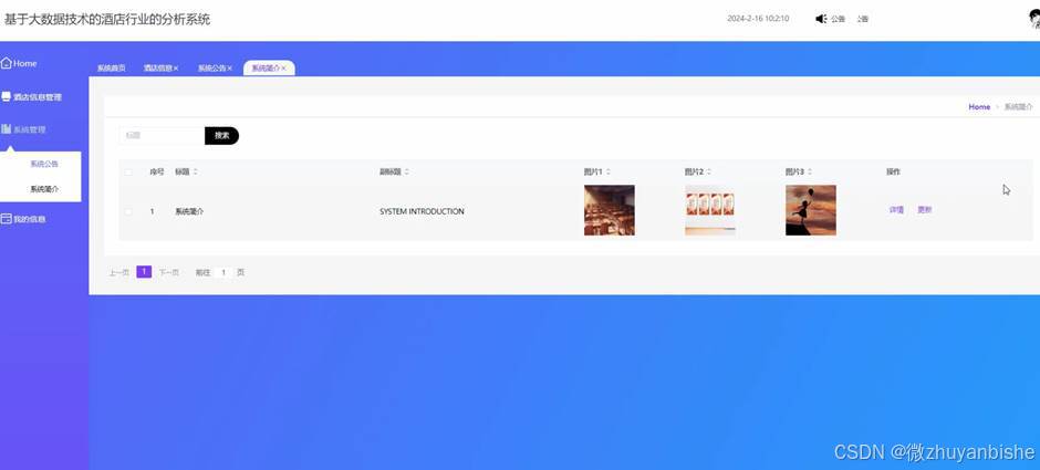 管理员点击系统简介,在系统简介页面中输入标题进行搜索,可以查看标题、副标题、图片1、图片2、图片3等详情操作。如图5.4所示: