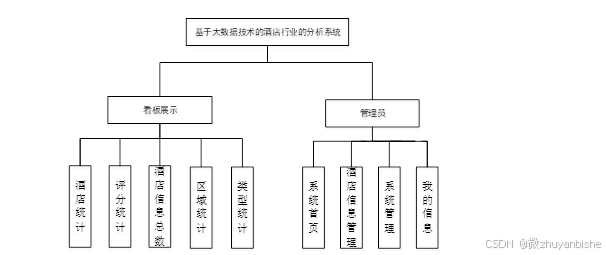 酒店行业的分析系统是基于Web服务模式,采用面向对象的程序设计方法,实现一个具有通用功能的模型结构。使用该系统的条件仅是需要具备连上互联网的能力,并能够通过移动设备登录系统。本系统分为大屏和后端,具体实现的系统功能结构图如图4.1所示: