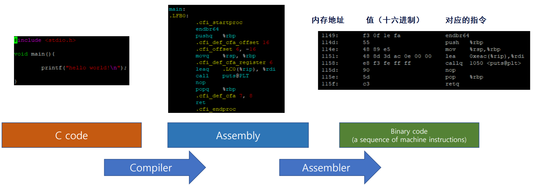 将高级C语言程序翻译成处理器读取和操作的二进制代码。