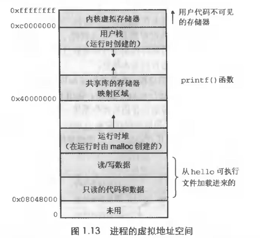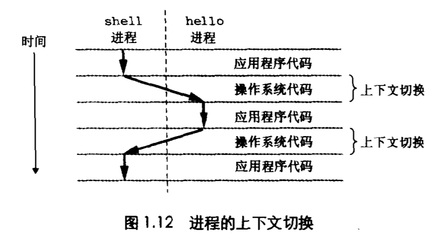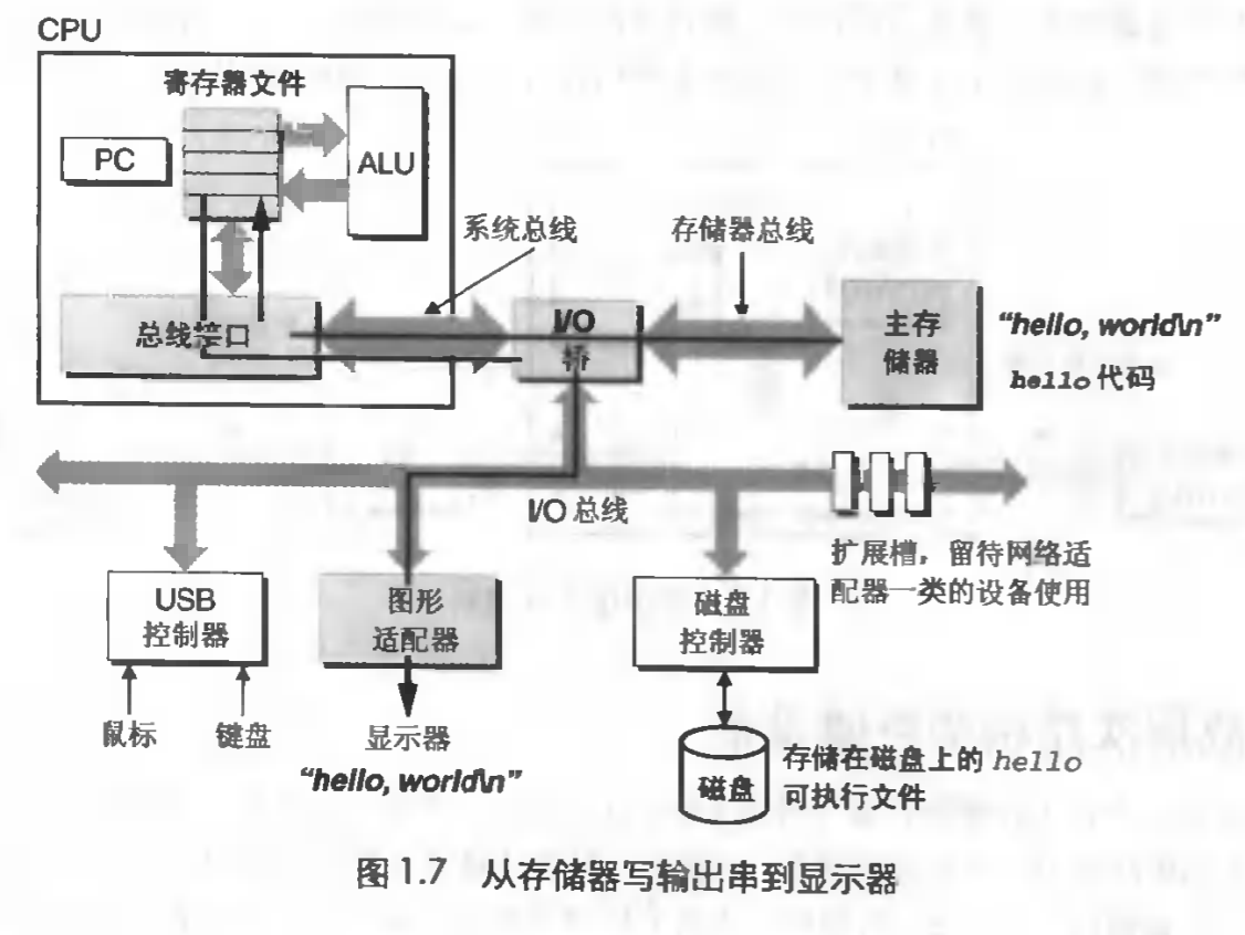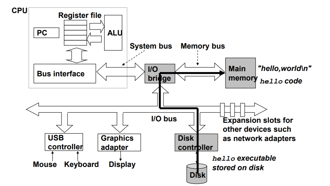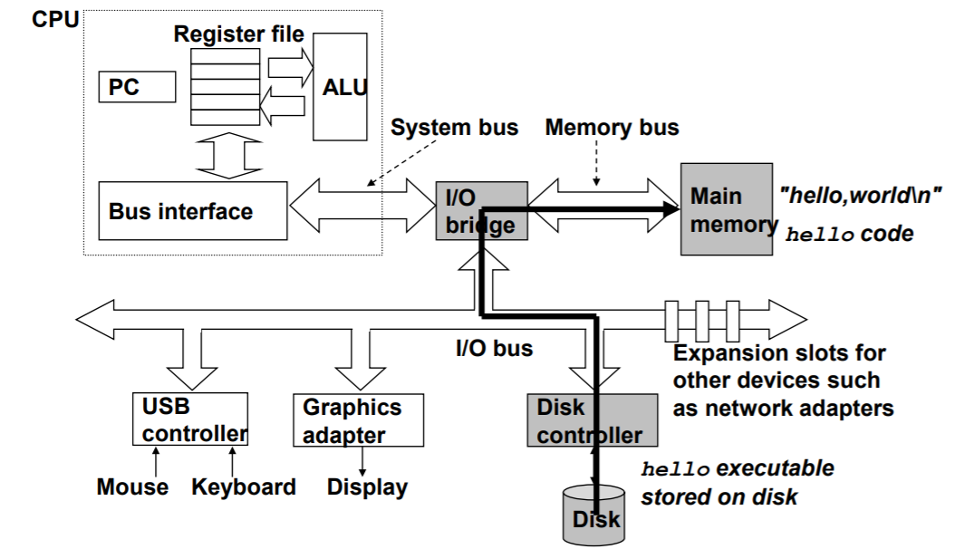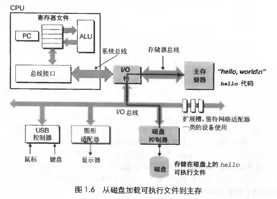 我们在键盘上输入字符串 ./hello 后,shell 程序就逐一读取字符到寄存器,再把它存放到寄存器中。当我们在键盘上敲回车键时,shell就知道我们已经输完了,然后 shell 会执行一系列指令,这些指令将 hello 目标文件中大哥代码和数据从磁盘拷贝到主存,从而加载 hello 文件。数据包括最终会被输出的字符串 "hello, world\n" 。