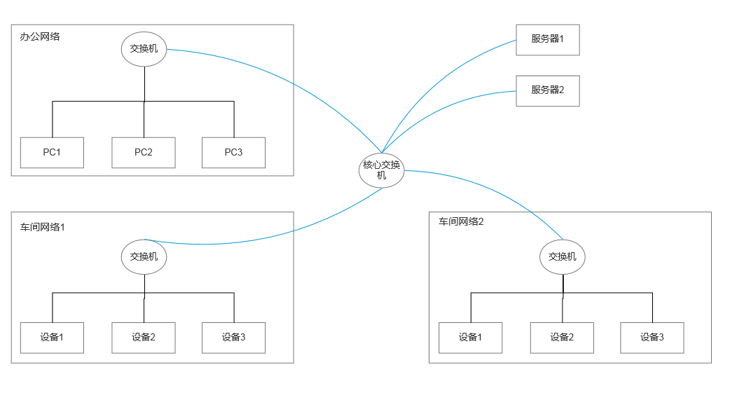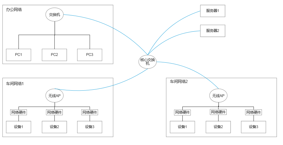 有线网络是最稳定也是最常见的网络部署方式。通过核心交换机把办公网络和车间网络进行隔离。每个车间单独用一个交换机。