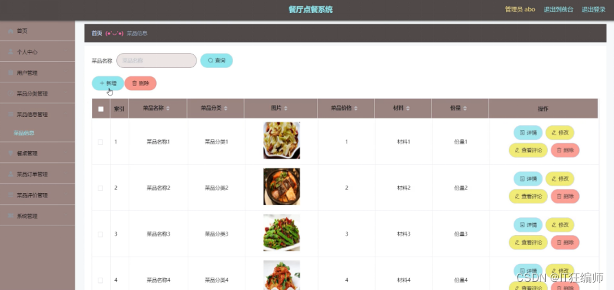 菜品信息管理,在菜品信息管理页面中可以查看菜品名称、菜品分类、图片、材料、分量、价格、菜品介绍等内容,并且根据需要对已有菜品信息管理进行添加,修改或删除等详细操作。