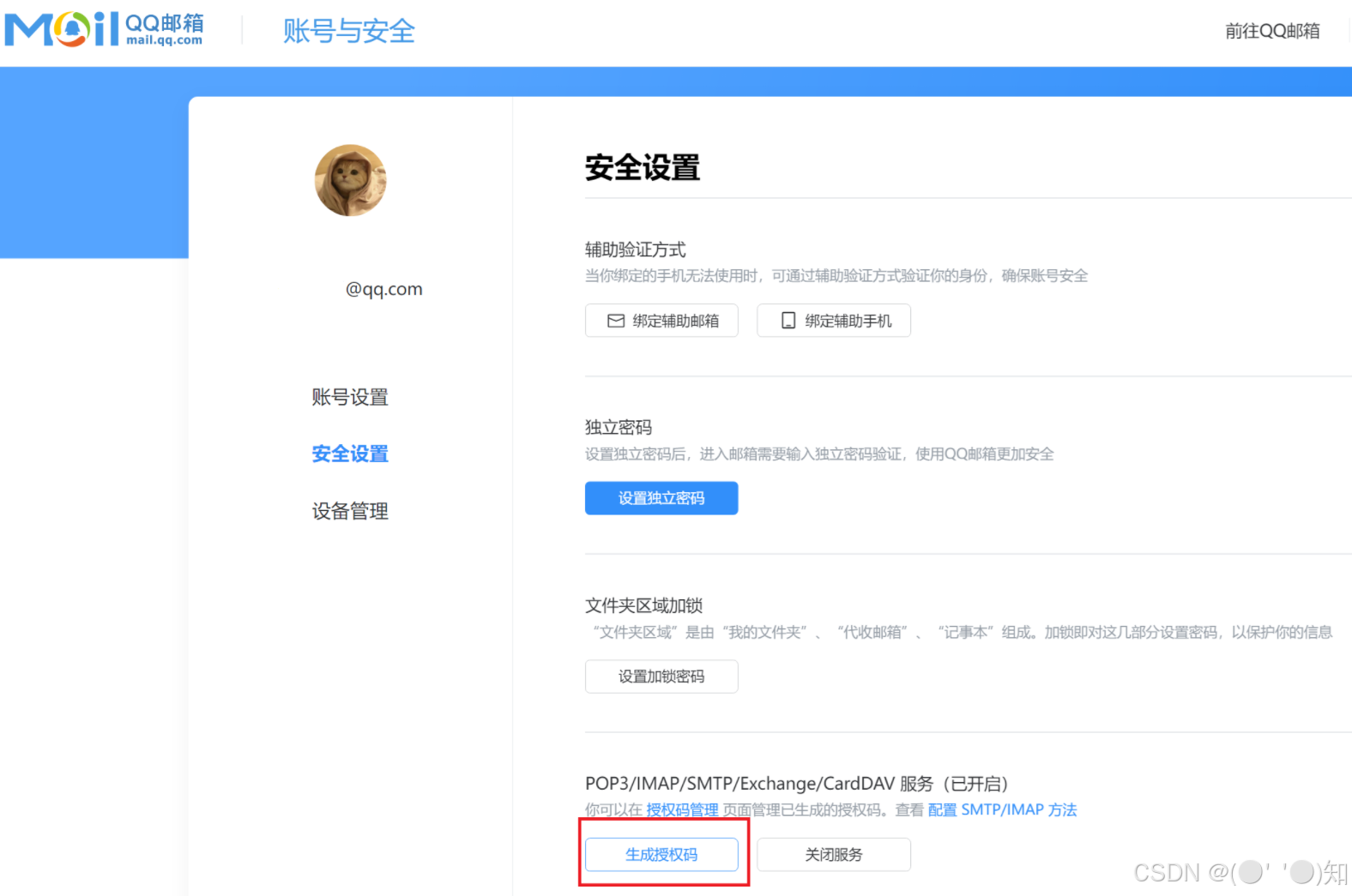 首先我们需要进行对开启POP3/IMAP/SMTP/Exchange/CardDAV 服务,获取QQ邮箱授权码