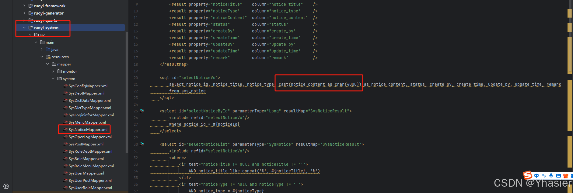 2.在system模块的xml的mapper文件夹内找到SysNoticeMapper.xml,其中的sql标签内有一个cast函数,它的作用是将结果转为对应类型,在达梦里需要给一个长度,填写稍大一点即可。