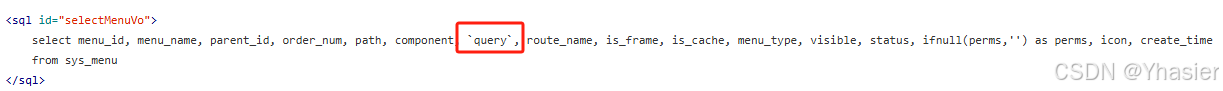 1.在在system模块的xml的mapper文件夹内找到SysMenuMapper.xml,这个文件中的query加了``,在mysql中是关键字,我们要将这个引号去掉,直接ctrl+f替换掉就好了。
