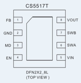 CS5517T是一款超微小型、超低功耗,高效率,升降压一体DC-DC调整器.适用于双节,三节干电池或者单节锂电池的应用场景.可以有效的延长电池的使用时间。CS5517T由电流模PWM控制环路,误差放大器,比较器和功率开关等模块组成。该芯片可在较宽负载范围内高效稳定的工作。CS5517T的输入电压为1.8V至5.0V提供可调输出电压为(1.2V至5V)。在输出电压为3.3V的情况下,输入从2.7V到4.4V,它能提供最大600mA的电流负载 . CS5517T可以通过调整两个外加电阻来设定输出电压。CS5517T提供了纤小的DFN2X2_8L封装形式 可供客户选择 ,其额定的工作温度范围为-40℃至85℃。