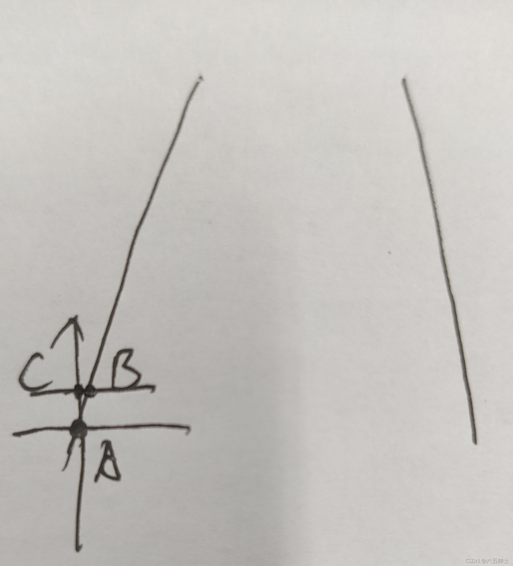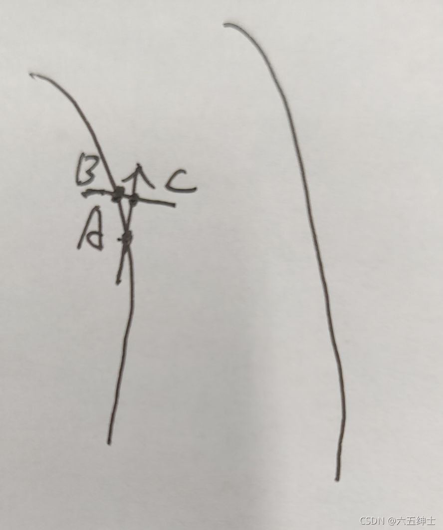 像这里,在我们第一次通过全部扫描最底行找到了A点之后,就可以记住A点的列坐标,在上面C点周围几个点搜索。这样可能只需要扫描很少的几个点就能找到边界了,同时,我们还可以通过C这一点的灰度值,判断搜线方向。比如C这一点是在赛道上是黑的,我们就可以从C点向右搜线,不管左边。如果C点在赛道中间,就往左搜线,不管右边,有节省了一些时间。这是左边线策略,右边线搜线同理。