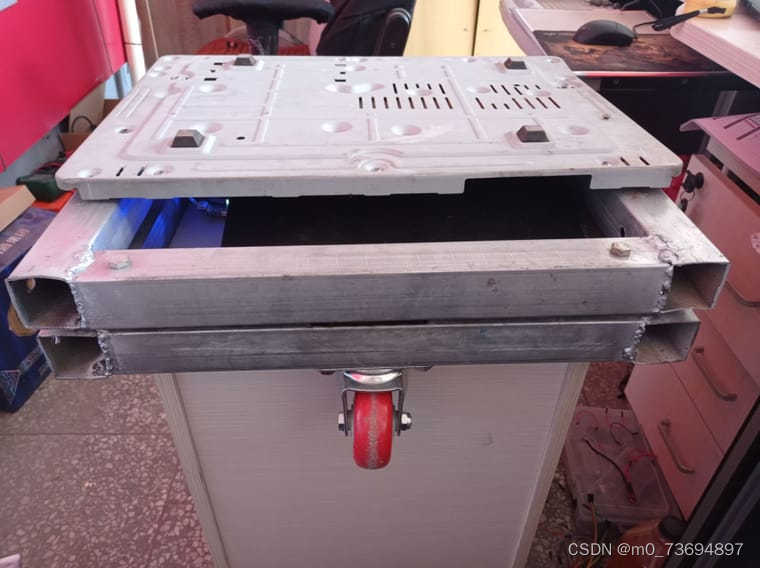 车架用40*40方管焊接而成,宽452毫米,长460毫米,车轮距517毫米(本人不是专业焊工,焊点有点粗糙)。