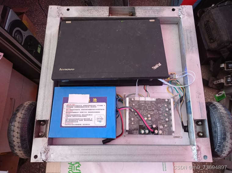 车架用40*40方管焊接而成,宽452毫米,长460毫米,车轮距517毫米(本人不是专业焊工,焊点有点粗糙)。36伏锂电,运控板选的RIKIBOT-FOC的大功率驱动板,主机板暂时用笔记本。2个6.5寸平衡车轮毂电机作轮子,和一个3寸万向轮。
