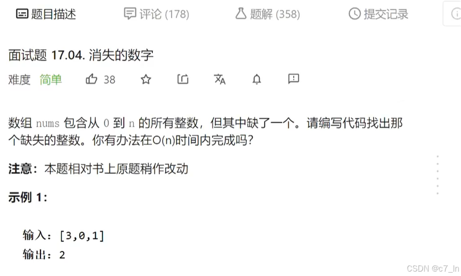 OJ链接:https://leetcode-cn.com/problems/missing-number-lcci/