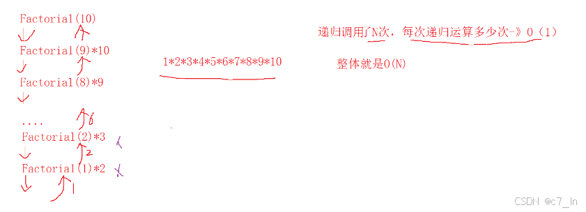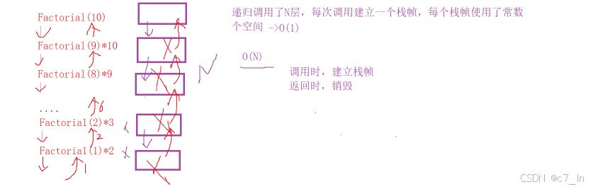 空间复杂度也是,根据最坏的情况也就是使用最多空间时的空间复杂度,该函数在回溯时才会对函数创建栈帧的空间销毁,所以空间复杂度为O(N)。