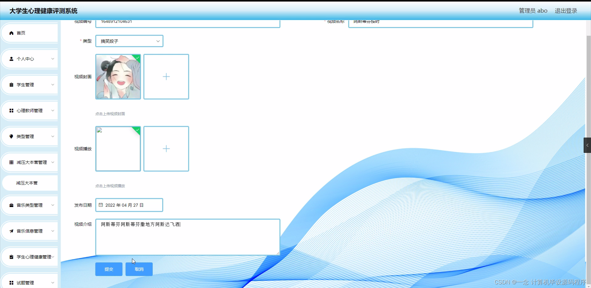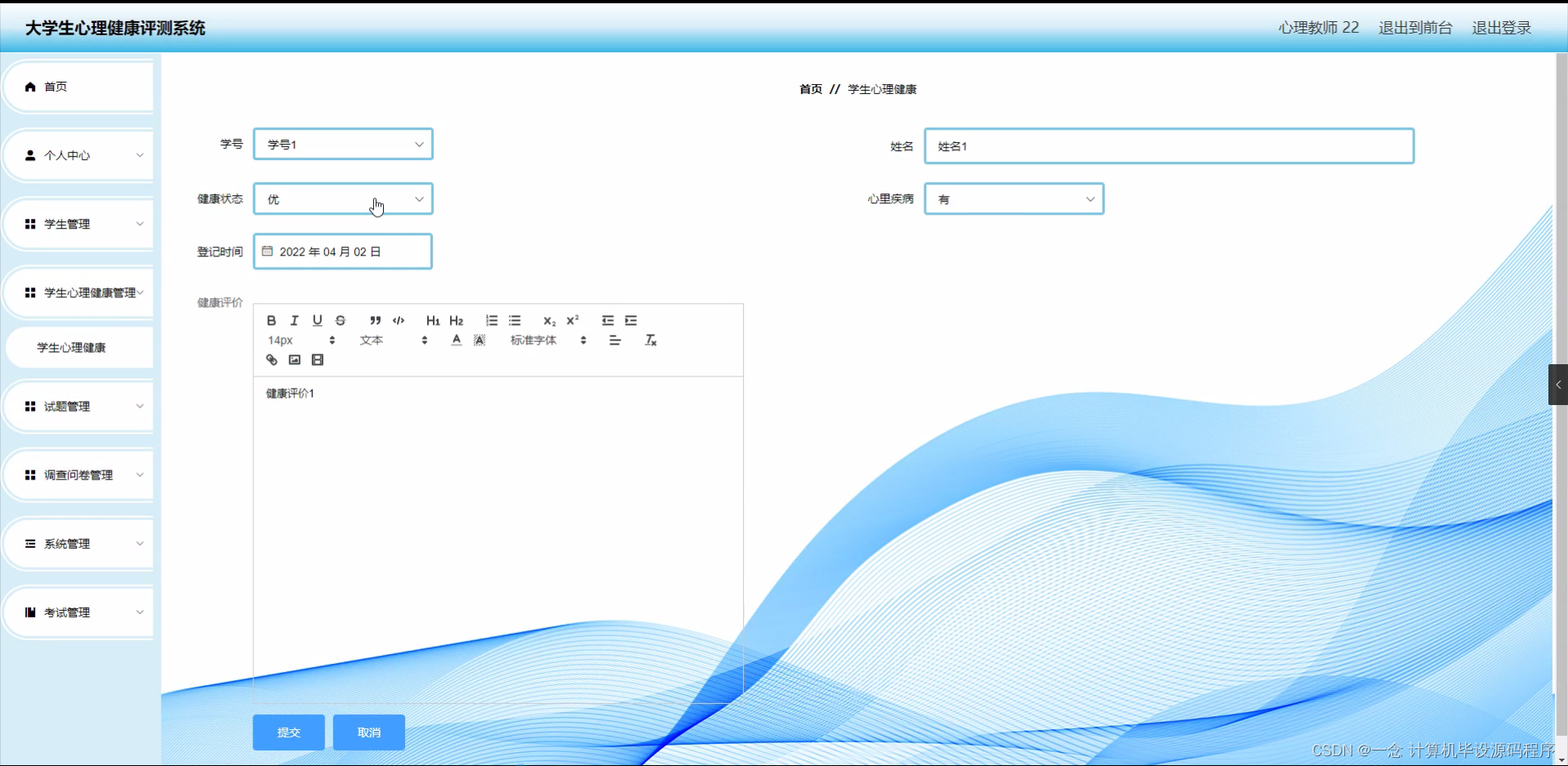 研究背景: 随着社会的发展和教育水平的提高,大学生心理健康问题日益凸显。大学生面临着学业压力、人际关系困扰、职业规划等多重压力,这些压力可能对他们的心理健康产生负面影响。因此,建立一套科学有效的大学生心理健康评测系统具有重要意义。