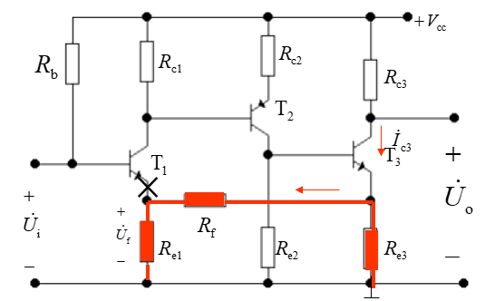 我们能看到,反馈的支路是 R e 3 , R f , R e 1 R_{e3}, R_f, R_{e1} Re3,Rf,Re1组成的通路,同样的,由于是串联反馈,所以我们要把输入和反馈通路相连的部分断开,如下图所示