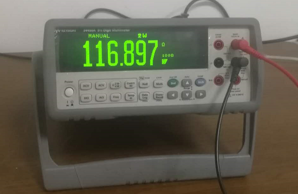 采用腐蚀等工艺,完成传感器的加工。传感器加工完成后实物图如下所示:实验中加工出两个传感器样品,其电阻值分别为116和118Ω(后续可以通过打磨,调节应变片初始电阻),均匀性误差在2%以内,考虑到电阻丝的宽度为250μm,相当于加工偏差在5μm以内,加工精度相对较高,并且不同产品性能相对稳定。