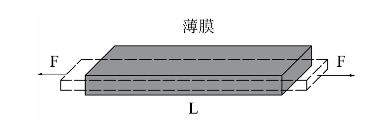 式中 ρ 为薄膜电阻率,L、w、t 分别为薄膜的长度、宽度与厚度;薄膜受沿长度方向的应力作用而产生应变时(如下图所示),其电阻变化 dR与 R 的比值即为薄膜为: