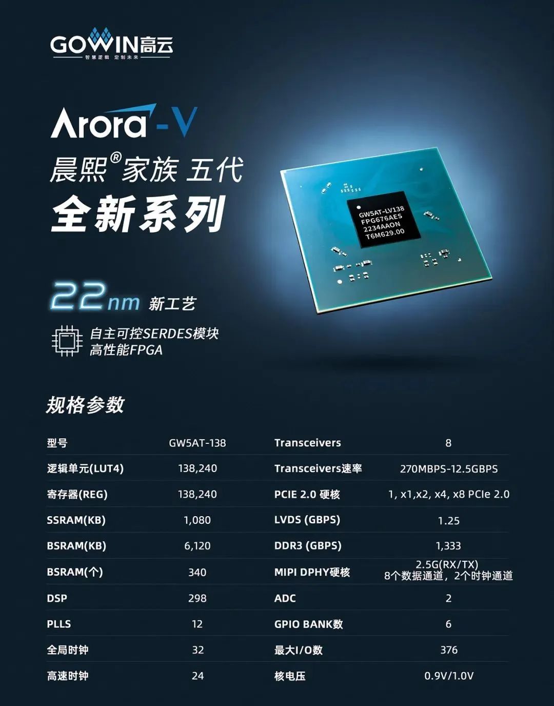 GW5AT-LV138FPG676A是高云半导体 Arora V 系列 FPGA 第一款产品,产品内部资源丰富,具有全新构架,高性能 DSP,高速 LVDS 接口以及丰富的 BSRAM 存储器资源,同时集成自主研发的 DDR3、8路12.5Gbps SERDES,集成PCIE 2.0硬核,MIPI 2.5Gbps DPHY硬核,适用于通讯、医疗、安防、工业、汽车等各个领域。广东高云半导体科技股份有