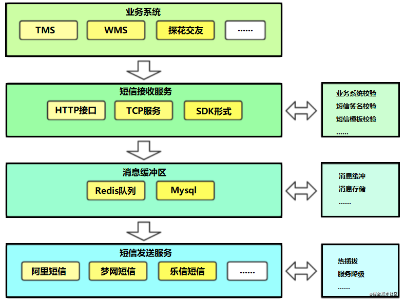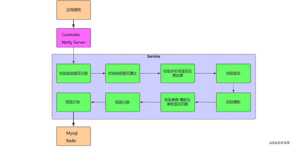 短信接收服务通过资质验证(可开关)、短信内容校验后将短信信息发送到对应中间件中(Redis、MySQL)。