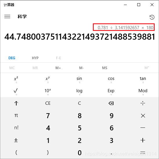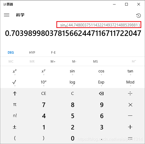 (4)例如孤度输入为0.781,计算器输出的sin(0.781/PI*180) = 0.703,和上面的结果一样,如下图: