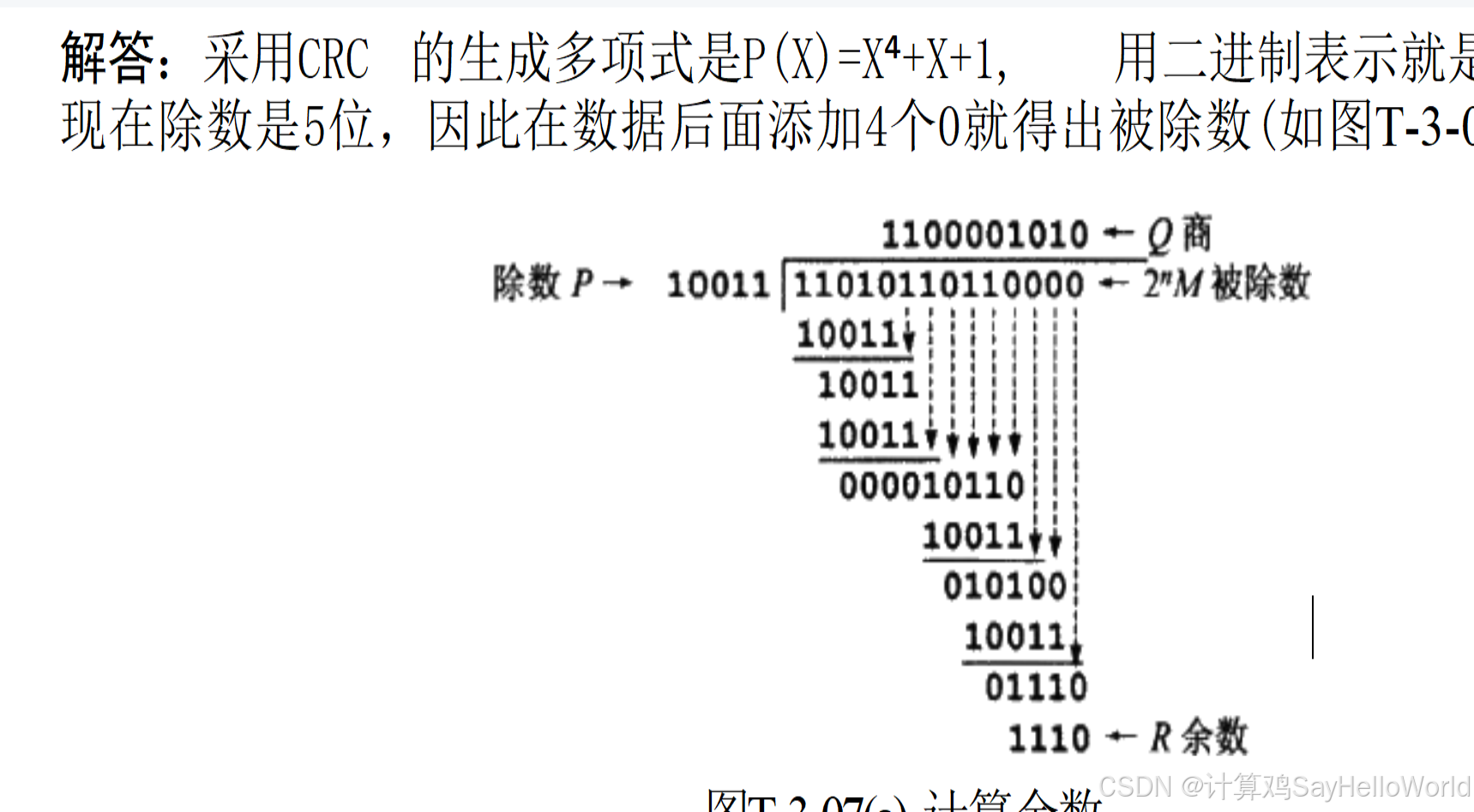 例1 要发送数据为1101011011。采用CRC检验,生成多项式为10011,则最终发送的数据为?