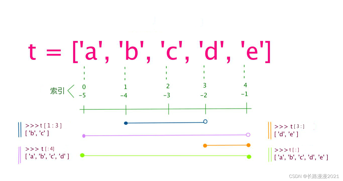 [头下标:尾下标:步长],其中头下标是从 0 开始算起,可以是正数或负数;尾下标可以为空表示取到头或尾;步长表示间隔。获取的子字符串包含头下标的字符,但不包含尾下标的字符。