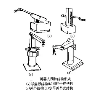 工业机器人主体结构中各个关节运动副和连杆构件组成了不同的坐标形式。常见的主体结构形式有:直角坐标形式、圆柱坐标形式、球面坐标形式、关节坐标形式。