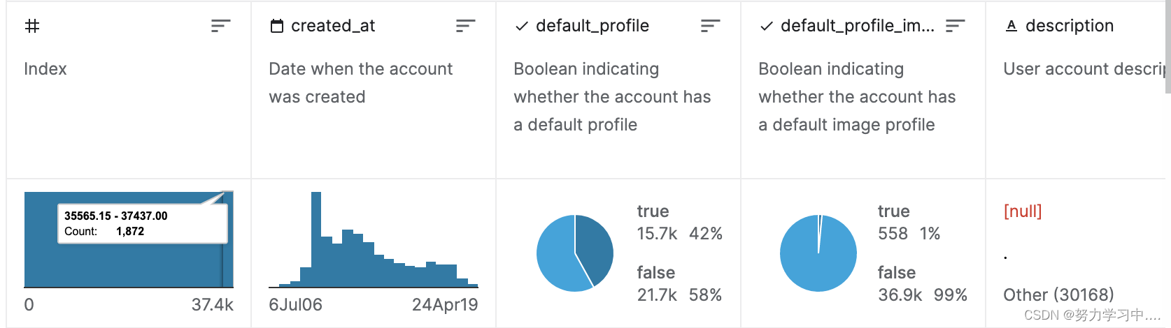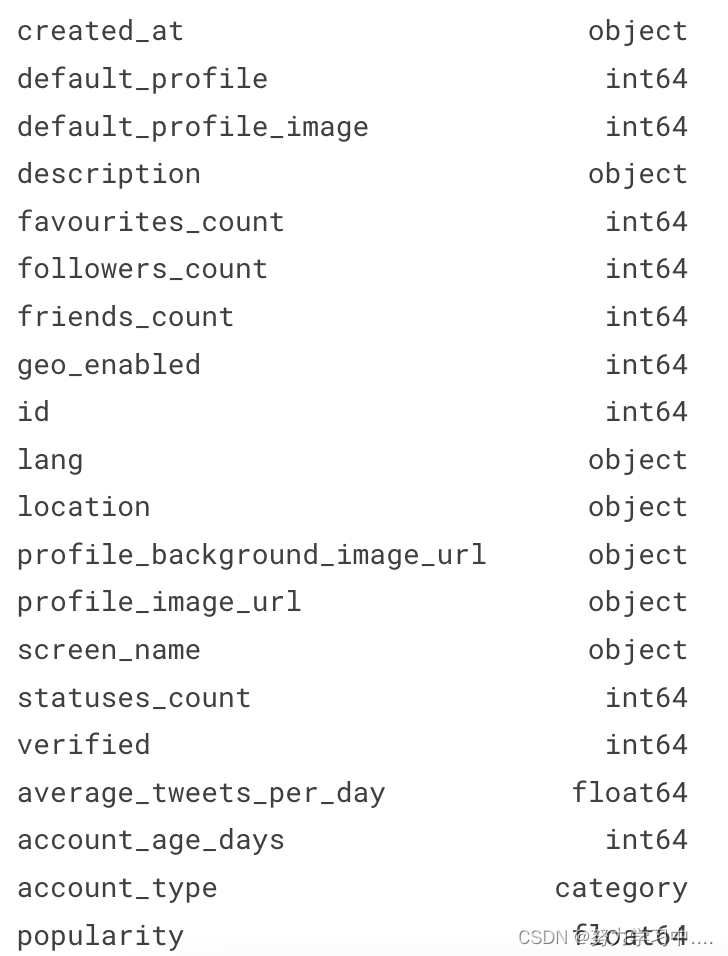还可以下载经过Twitter API收集后的账户,下载链接为:bots_accounts_eda | Kaggle, 此数据集由37438行组成,这些行对应于 Twitter 中的不同用户帐户。每行包含20列,这些列是通过 Twitter API 收集的特性。